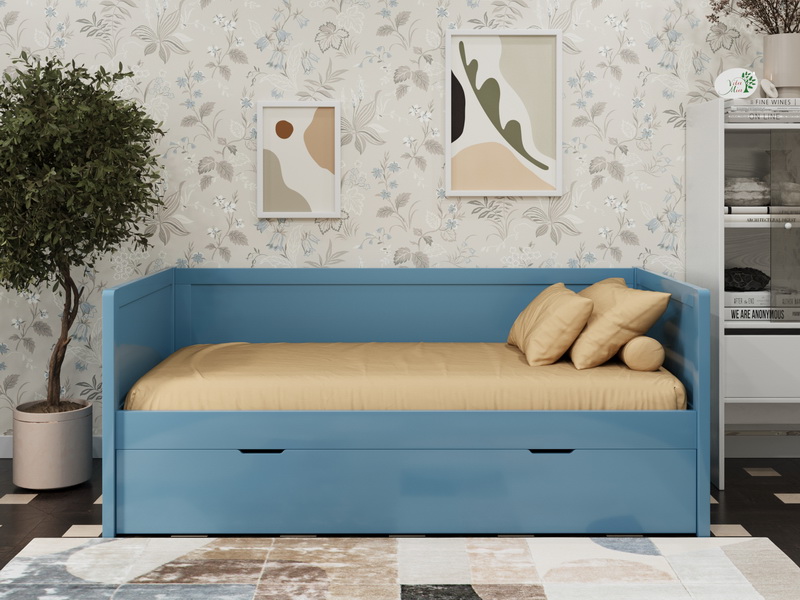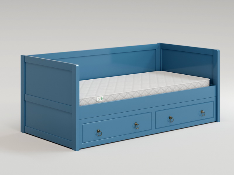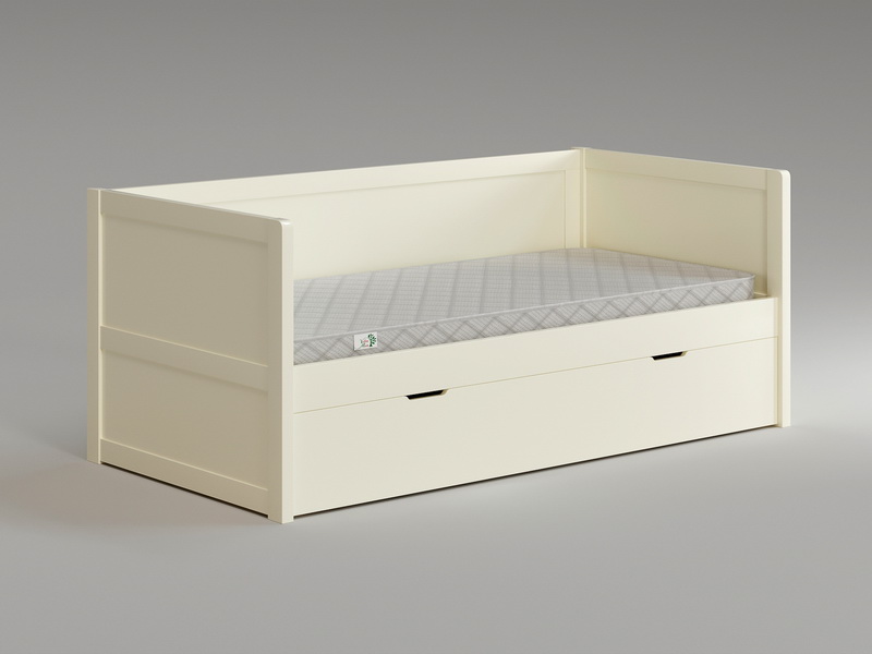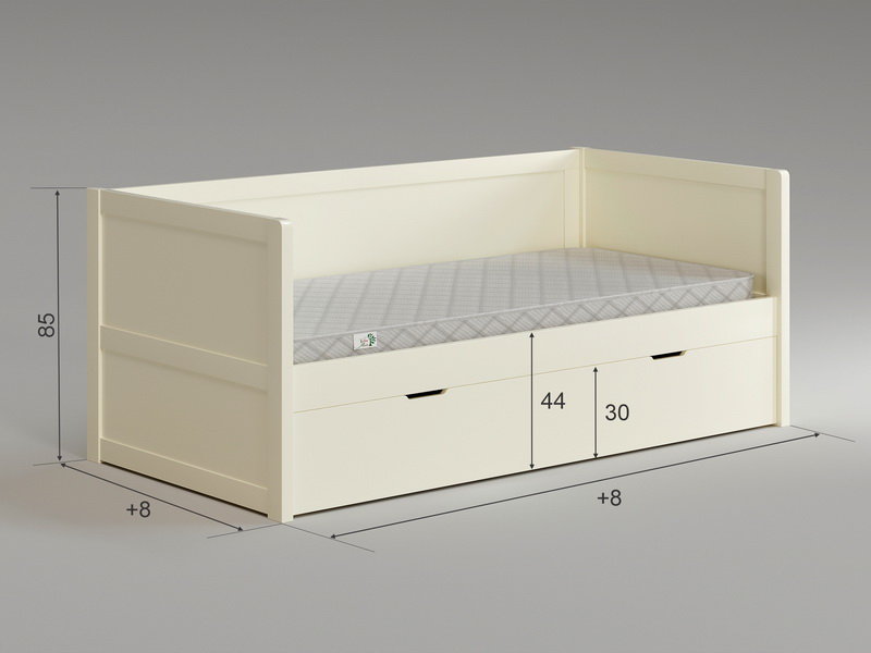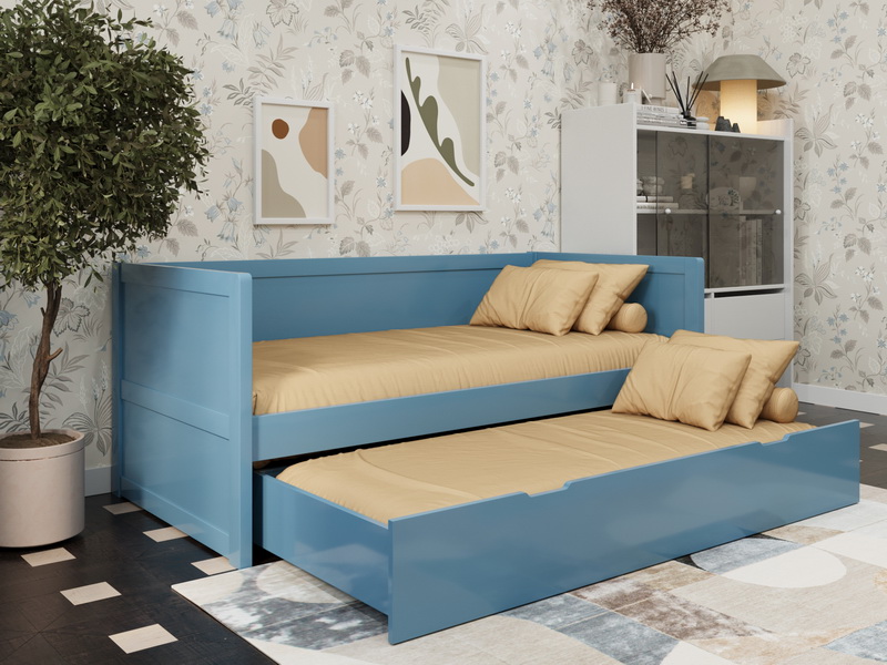 Главная особенность — дополнительное выкатное спальное место, которое скрыто под основным и полностью выдвигается на колесиках. Это идеальное решение для детской комнаты или для приема гостей. Размер выкатного места на 10 см короче в длину основного (например, при основном 90×200 см, выкатное будет 90×190 см) и с максимальной шириной 90 см