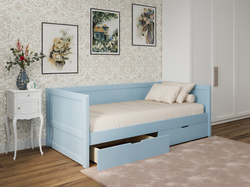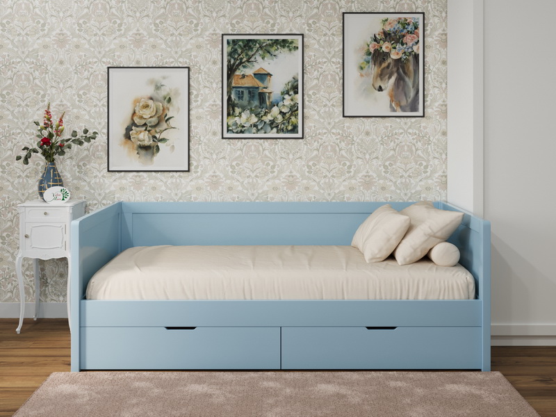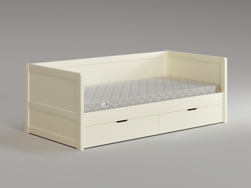 Главная особенность — выкатные ящики, которые обеспечивают доступ к просторному внутреннему отделению для хранения постельного белья, подушек и сезонных вещей. В комплектацию также входит основание из прямых ламелей, сверху на них укладывается лист оргалита.