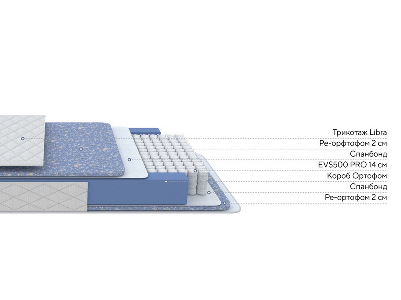 Комфортные слои матраса ProSon Libra F - выполнены из материала на основе натурального кокосового волокна, хорошо пропускают воздух и создают оптимальный микроклимат спальнго места. Данная модель обеспечивает надежную поддержку вашего тела во время сна и отдыха. В основе модели современный мультизональный блок EVS 500, где на каждый квадратный метр приходится 256 автономно работающих пружин, благодаря чему матрас становится более плотным, эластичным и гибким.